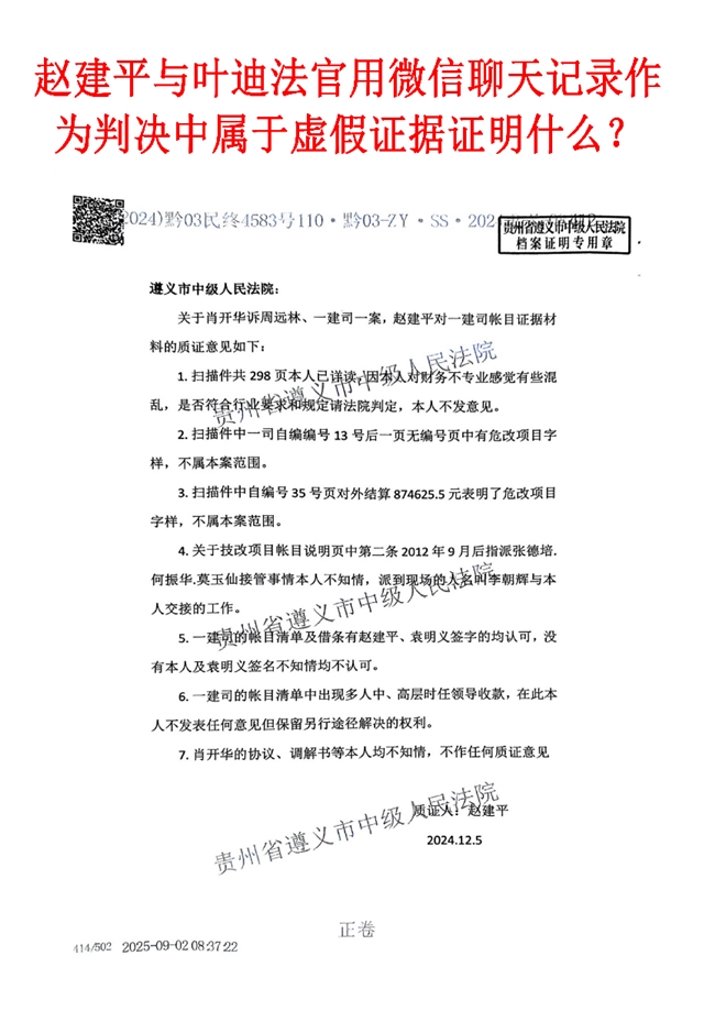 因被上诉人串通一二审法官,所以二审法院(2024)黔03民终4583号民事判决,驳回上诉请求、维持原判,该判决第23、24页中,一建司出示支付序号有5、8、13、20、30、25、32号等提供的虚假支付劳务费269万元未质证,未经肖开华同意分别支付给冯利平、田克、付亚松、罗卫等人的“劳务工资”无任何施工记录,考勤表证人证言的证据,明显不具备真实性,并且本案2014年11月8日庭审笔录第8页,赵建平当庭陈述看到的高管人员的签字,发现吃拿回扣的嫌疑,本人保留向纪委举报的意见,证明二审法院故意帮助一建司隐瞒虚假支付,清楚案涉工程款的事实,严重违规违纪违法的事实。