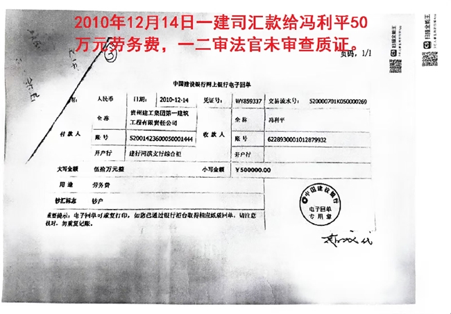 第三人:贵州建工集团第一建筑工程有限责任公司(以下简称一建司)责任人赵建平与负责人申永东出示支付赁证的序号:5、8、13、20、25、30、32号等虚假支付劳务费共计269万元,分别支付给冯利平、田克、傅亚松、罗卫等人劳务工资的证据未质证。